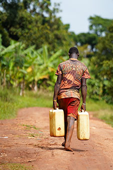 Every morning, before the sun's even up, he starts walking. Lifting his jerrycans onto his shoulders, he begins the long journey down a narrow dirt path, through the dense brush and trees to gather water.